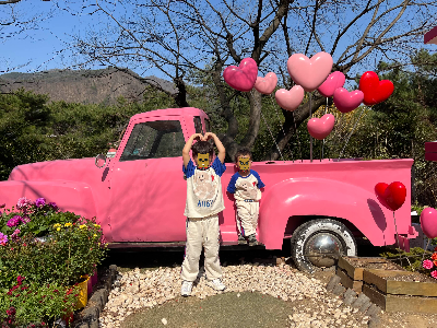 출구로 가는 길에 분홍 자동차에서 아이들의 기념사진을 찍어줬어요.