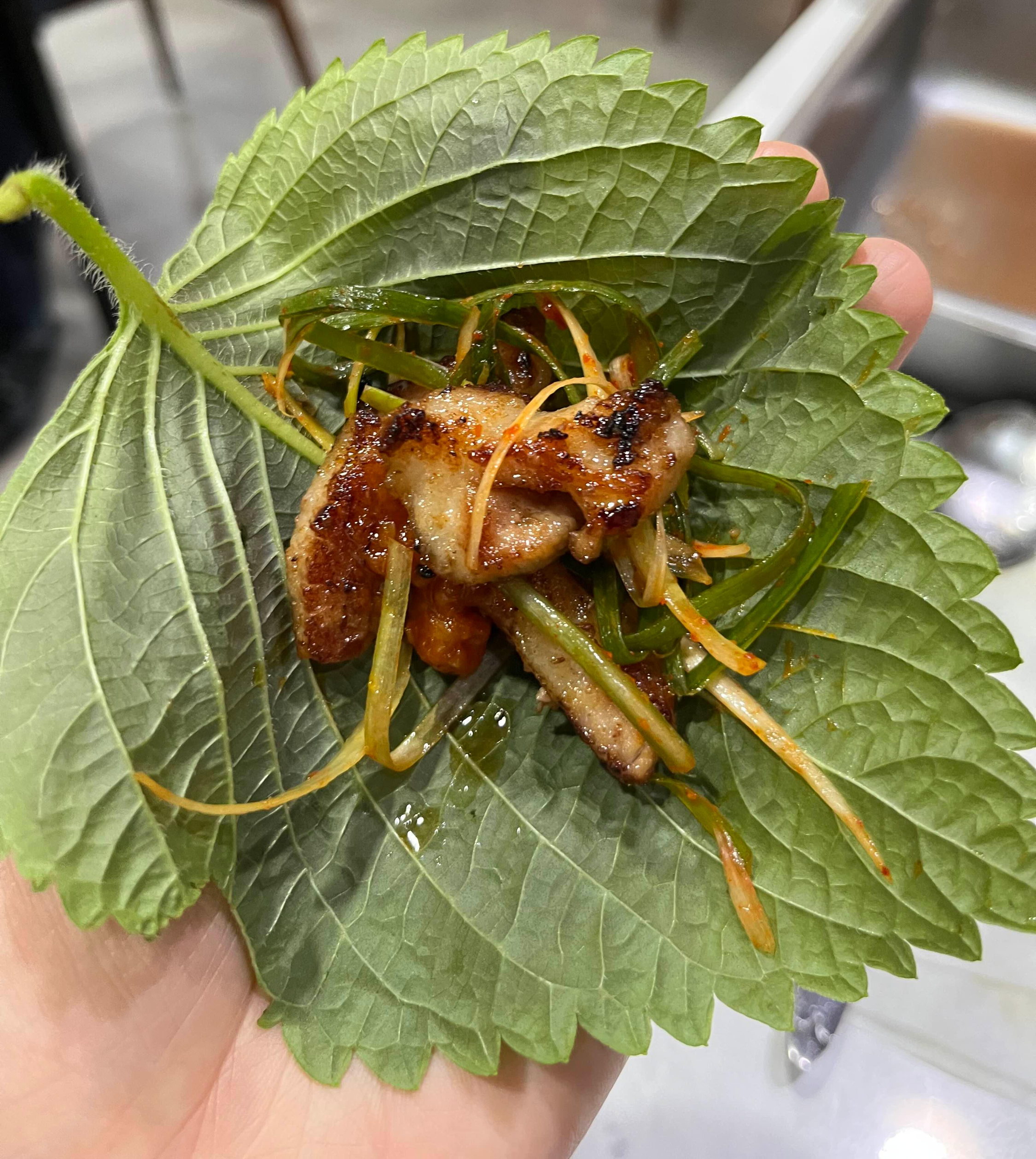 쌈 싸 먹는 조합도 강추! 깻잎 또는 상추 위에 파절이, 고기, 마늘, 쌈장을 올리면 그야말로 환상적인 맛!