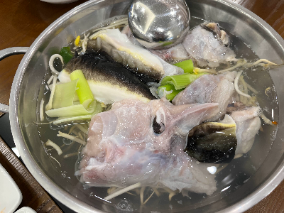 이틀 뒤, 남편이 복어탕 얘기를 듣고 "나도 먹고 싶어!" 해서 재방문했어요. 이번엔 국산 밀복 맑은탕 2인분과 복어튀김을 주문했답니다. 직원분이 복어튀김은 시그니처 메뉴라고 하셔서 기대를 안고 주문했죠!