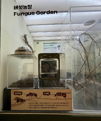 현재 진행 중인 개미세계탐험전에서는 불개미, 잎꾼 개미등 다양한 개미들의 생태를 생생하게 볼 수 있어요. 특히 잎꾼개미의 생태가 인상 깊었는데, 이 개미들은 나뭇잎을 잘라 길게 이어진 나뭇가지 위를 지나 개미집까지 운반을 합니다. 그 과정이 너무 체계적이고 흥미로워서 한참을 관람했죠. 더 놀라운 점은 잎뿐 아니라 다른 개미를 태우고 가는 모습도 볼 수 있다는 것! 이유는 바로 운반 중인 개미들이 적의 공격에 취약해 자신을 보호하기 위해 다른 개미를 태워 함께 데려간다고 합니다. 잎꾼개미 사회는 운반개미, 병정개미, 농부개미 등 역할이 나뉘어 체계적으로 움직여요. 가장 신기했던 점은 개미가 버섯 농사를 짓는다는 점이에요. 잎꾼개미가 나른 잎을 지하 창고에 보관해 잎을 잘라 균류를 키워 양식을 얻는다고 해요. 이렇나 모습은 어린이들에게도 자연의 질서와 생명의 경이로움을 느끼게 해 줍니다.
