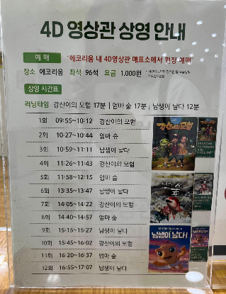 2층에는 에코라운지 숨, 쉼이라는 공간이 있는데, 체험존과 키 125cm 이하의 아이들이 이용할 수 있는 작은 놀이시설이 마련돼 있어요. 또 2층 카페 옆에는 4D영상관이 있는데, 관람료는 단돈 1,000원으로 성인, 어린이 모두 동일한 가격이에요.