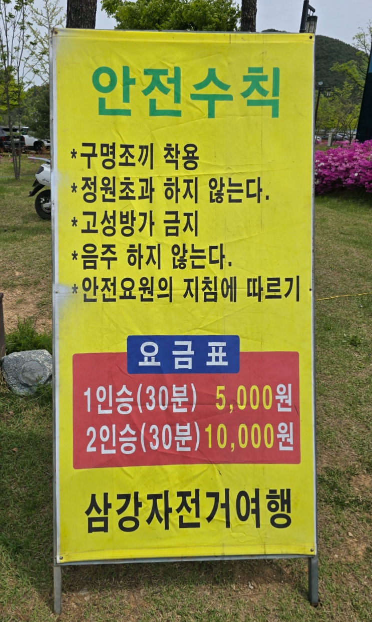 삼강문화단지에서 아이들이 가장 좋아했던 것은 전기 깡통자전거였어요. 아이들이 깡통자전거를 보자마자 눈을 반짝이며 타고 싶다고 했는데 자전거를 태워주면 너무 힘들까 봐 고민했는데 이곳 깡통자전거는 전기자전거로 운영되고 있어 어른이나 아이 모두 부담 없이 즐길 수 있었어요. 직접 운전하면서 느낀 시원한 바람과 강변을 따라 이어지는 코스 덕분에 저도 즐겁고 아이들도 신나서 다시 타고 싶다며 좋아했어요.