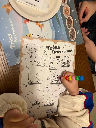 아이와 외식할 때 가장 고민되는 순간은 바로 음식이 나오기 전까지의 대기시간인데요. 트라이아스는 그런 고민을 단번에 해결해 줍니다. 아이들을 위해 공룡 그림 종이와 색연필이 준비되어 있었고, 아이는 공룡 그림을 보자마자 집중해서 색칠하기 시작했어요. 평소엔 음식이 나올 때까지 기다리는 걸 힘들어했는데 이날은 놀랍게도 식사가 나오기 전까지 조용히 색칠에 열중해서 부모 입장에선 정말 편했습니다.