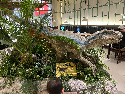 식당 입구에 들어서자마자 눈앞에 펼쳐지는 다양한 공룡 모형들! 티라노사 우르, 랩터, 오비랍토르 등 인기 공룡들이 큼직하게 전시되어 있어 아이들이 입구에서 한참을 머물러있었어요. 내부에는 공룡뿐 아니라 몇몇 동물 모형도 함께 있어 동물을 좋아하는 아이들에게도 흥미로운 공간이었습니다. 식당으로 들어가기가 무서울 정도로 입구가 너무 재미있었달까요? 첫째는 입구에서부터 너무 좋아했어요.