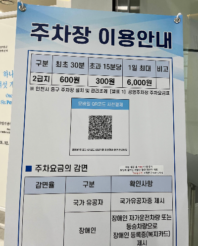 - 주 차 : 기본 30분 600원, 초과 15분 당 300원, 일 최대 6,000원