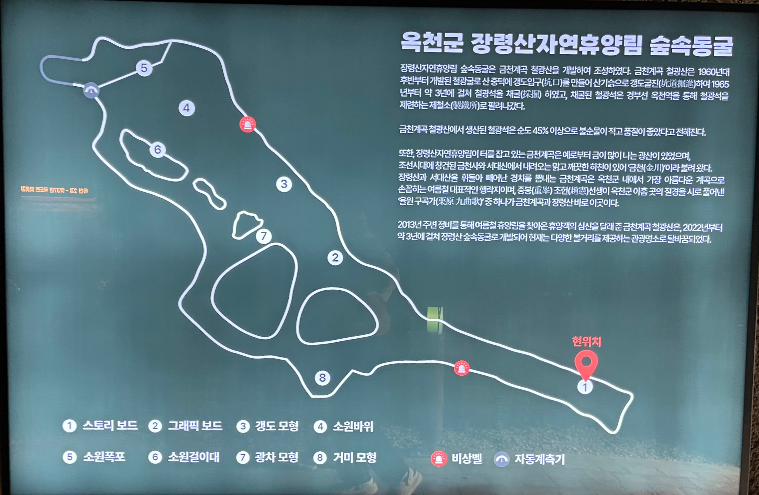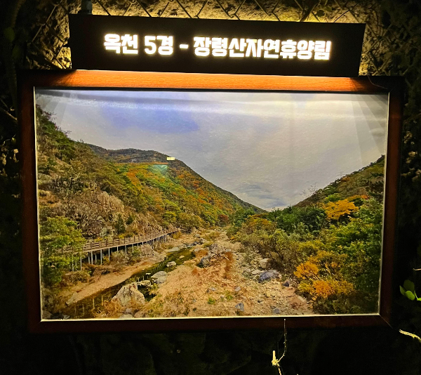 음악분수대 주차장 바로 옆에는 숲 속동굴 체험파크가 자리하고 있어요. 이 동굴은 원래 금천계곡 철광산을 개발해 만든 공간으로 내부에는 옥천 8경 사진 등 다양한 전시물이 꾸며져 있어 볼거리가 많았어요. 동굴 입구엔 옥천 8경 사진이 전시되어 있고 내부에는 포토존이 많아 아이와 함께 사진도 많이 찍고 즐거운 시간을 보냈답니다.