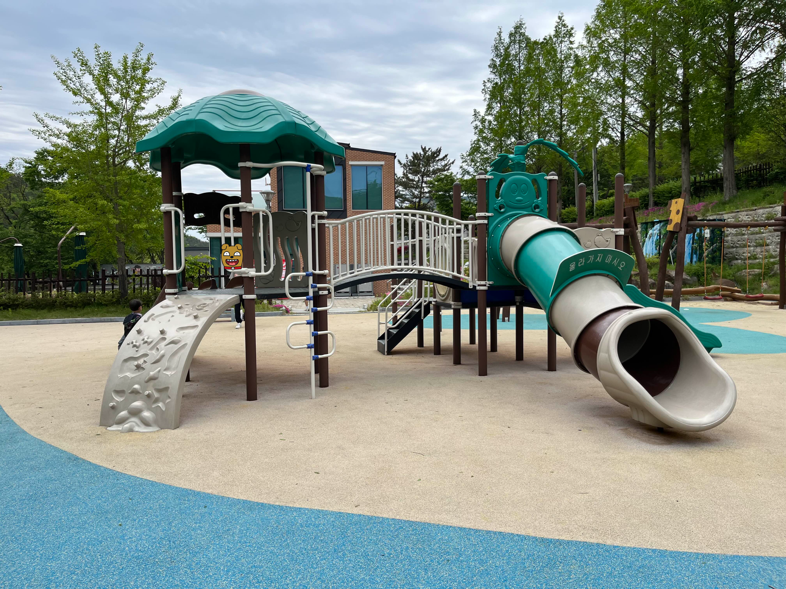 주차장 아래쪽에 있는 다리를 건너면 아이들을 위한 놀이터가 나와요. 넓은 공간에 모래놀이, 다양한 놀이시설 그리고 아이들이 특히 좋아하는 집라인까지 준비돼 있었어요.