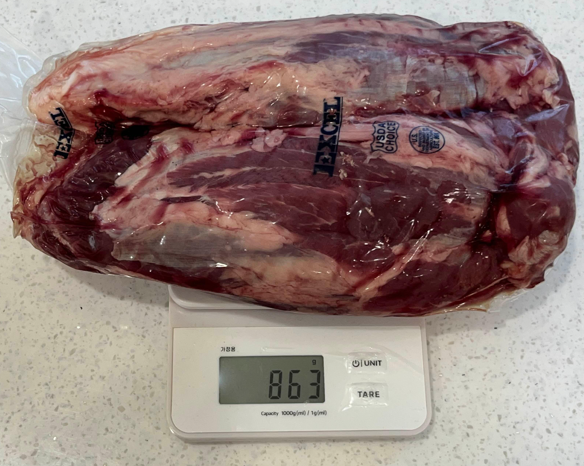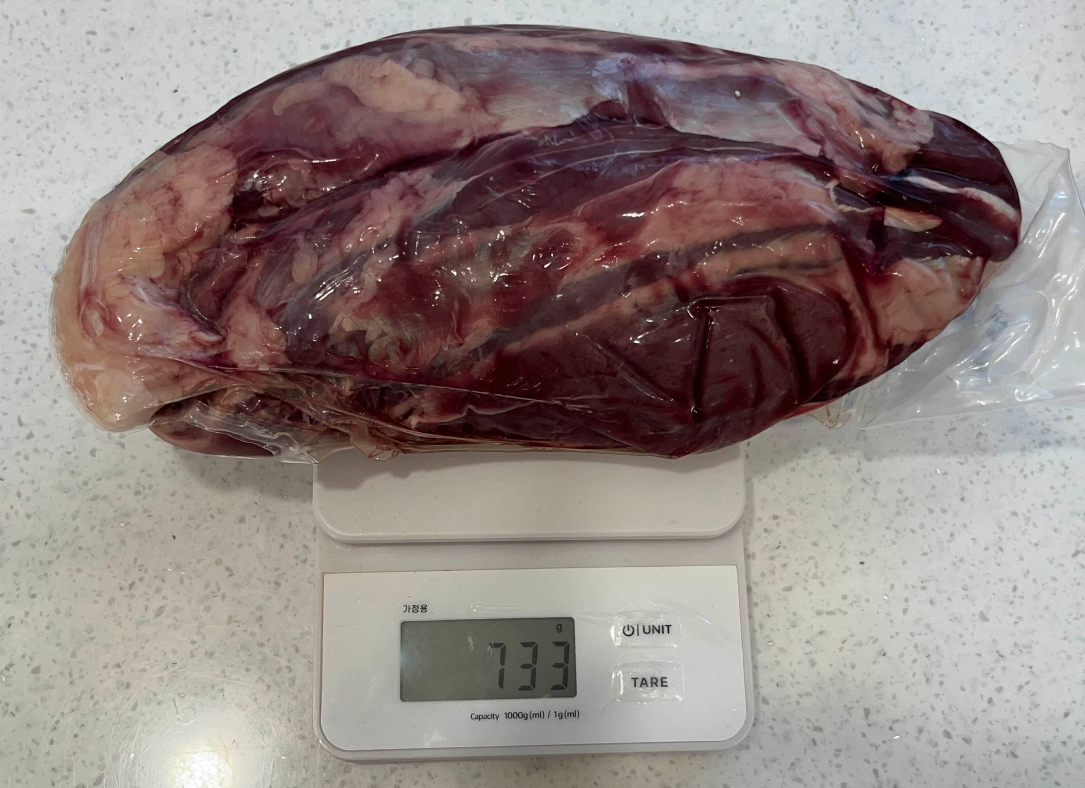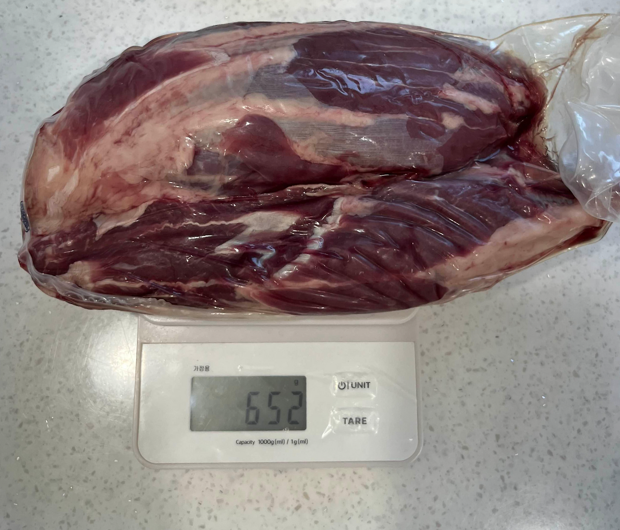 많은 양이 부담돼서 진열된 것 중 무게가 가장 적은 걸로 골랐어요. 총 3덩어리로 구성되어 있었고 각가 무게는 652g, 733g, 863g이었습니다. 2kg 덩어리 고기인 줄 알았는데 3덩어리로 분리되어 있어 손질 부담이 줄었어요.