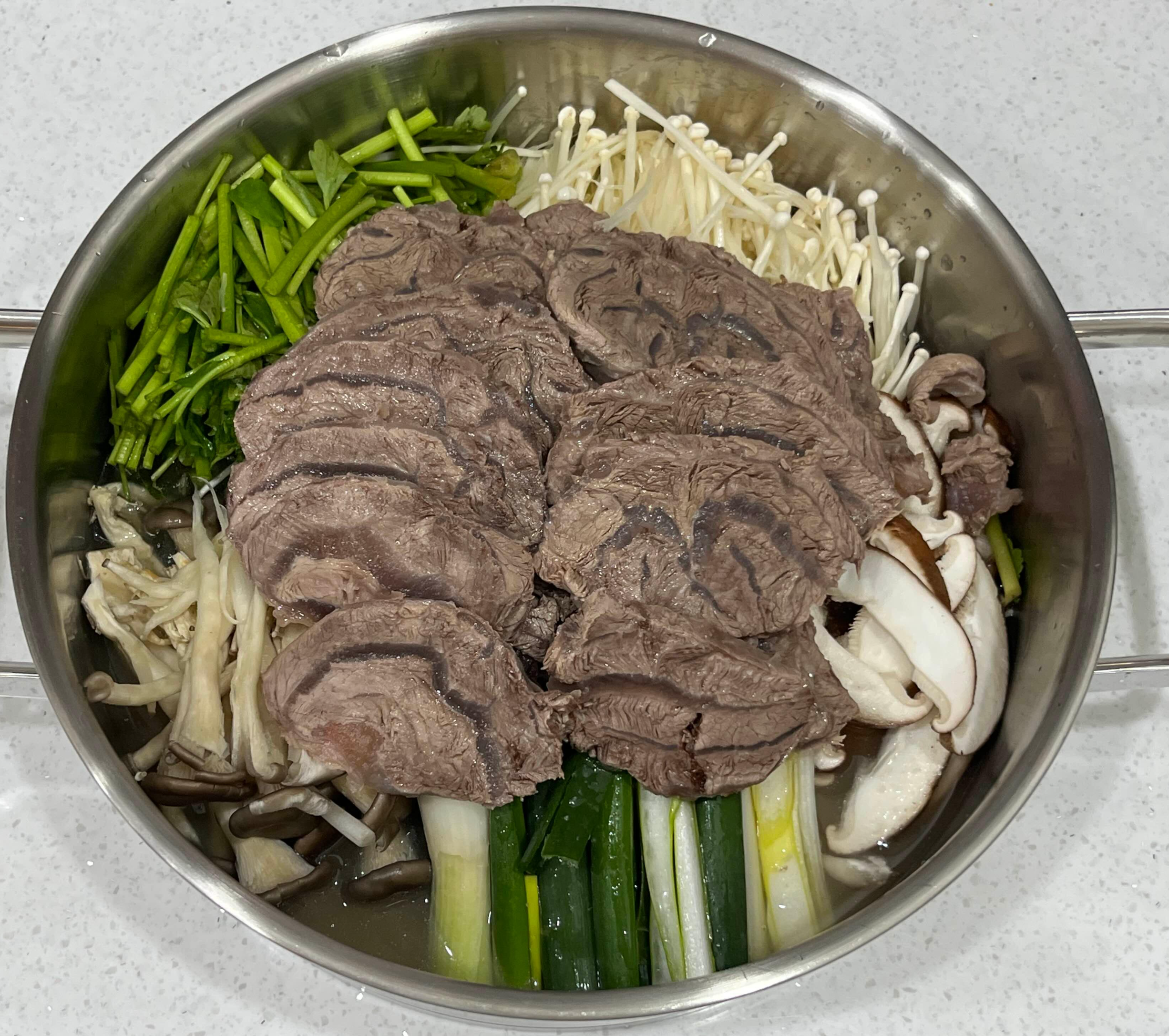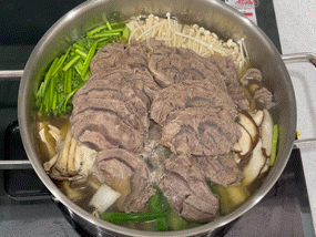 - 냄비에 채소, 고기 순으로 올리고 육수를 넣어주세요. 육수는 채소가 잠길 정도만 넣어주세요.