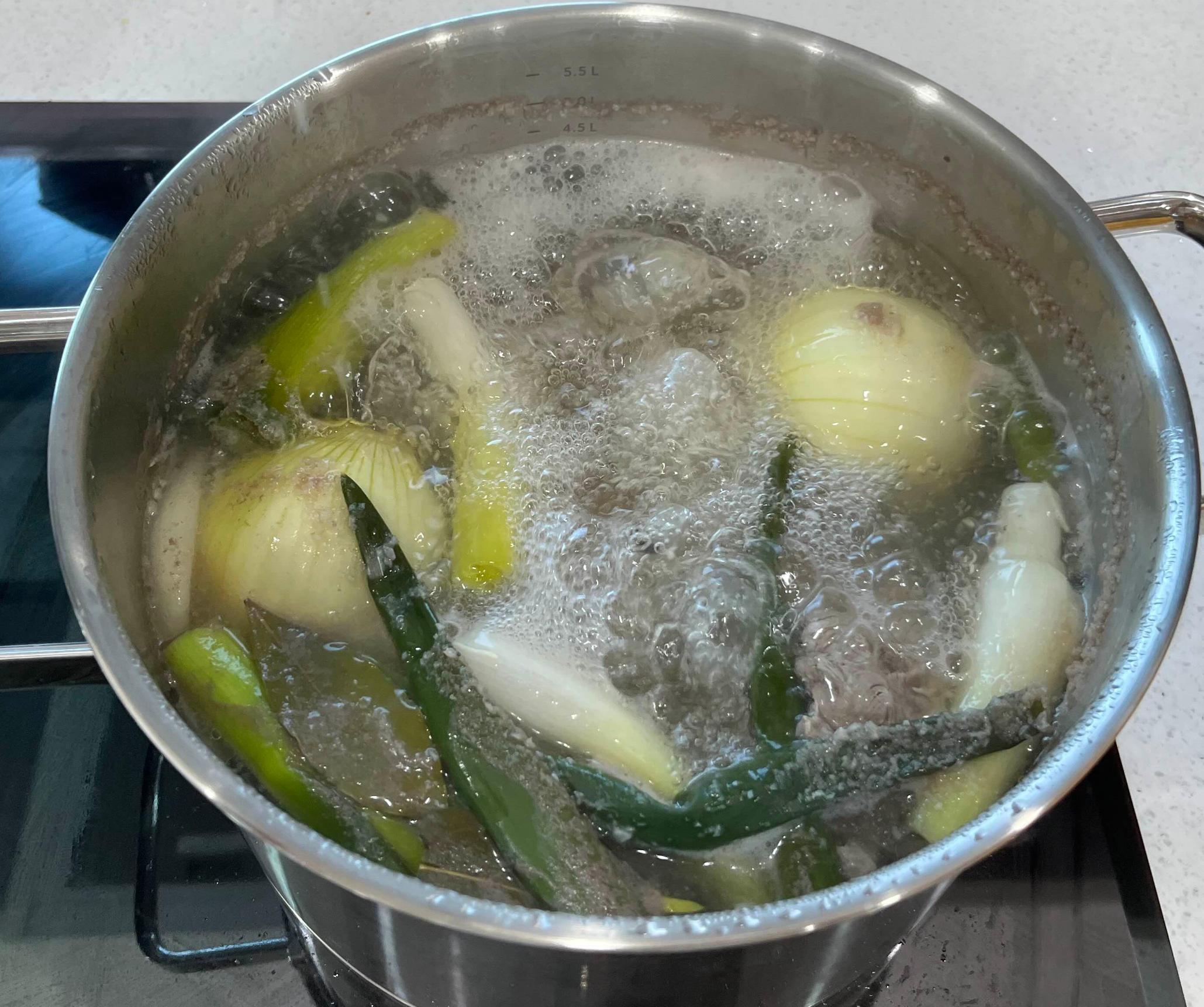 - 물 2L에 대파 2대, 큰 양파 1개, 소주 반컵, 미림 3숟가락, 통마늘 10알, 통후추 30알, 소금 1 티스푼을 넣고 끓여주세요.