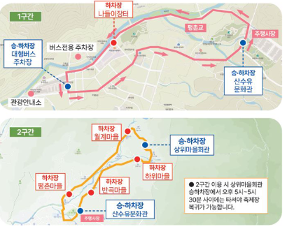 원좌로터리 → 산수유문화관→ 반곡 → 상위 → 평촌교 → 관광안내소→ 평촌교 → 관광안내소
