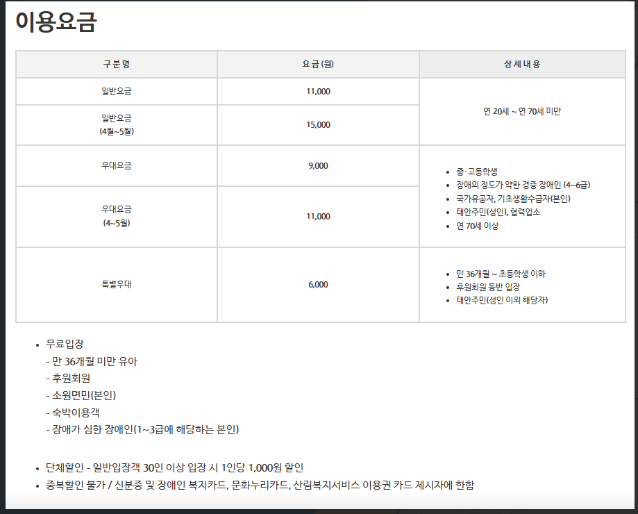 - 만 36개월 미만 유아, 1~3금에 해당하는 장애인 본인, 소원면민 본인, 숙박이용객, 후원회원 무료